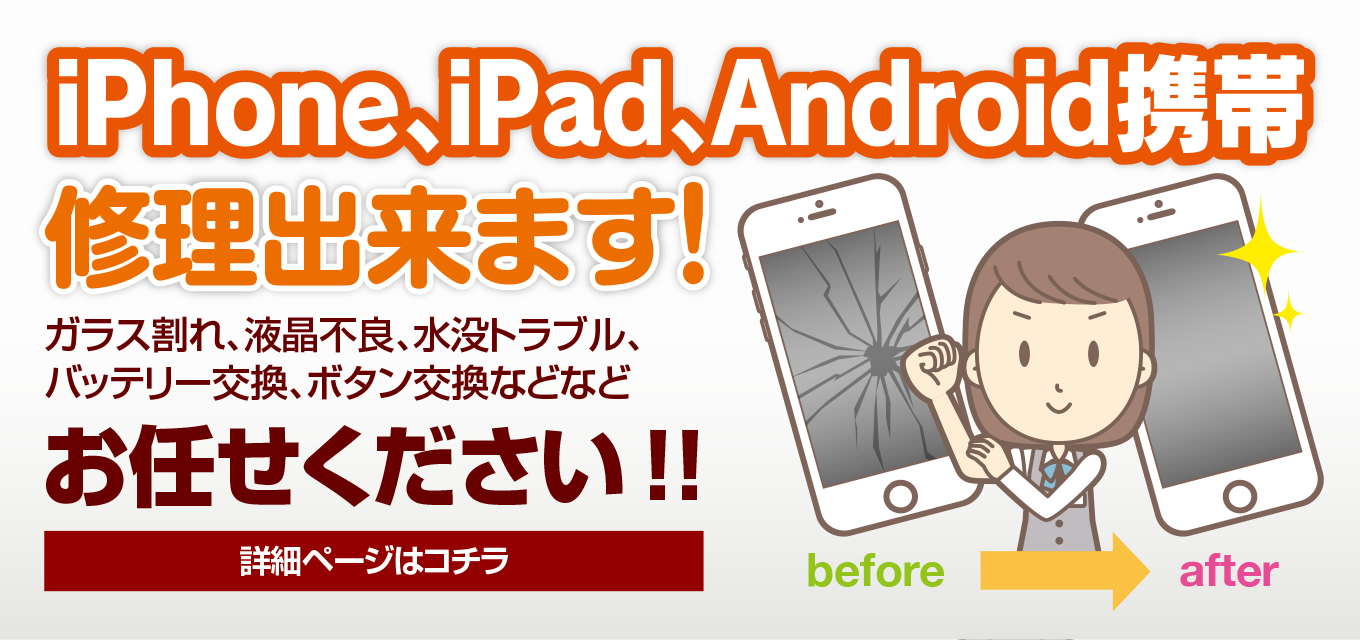 iPhone・iPad・Android・Nintendo Switchなどの修理を即日から対応いたします。ガラケーもご相談ください。